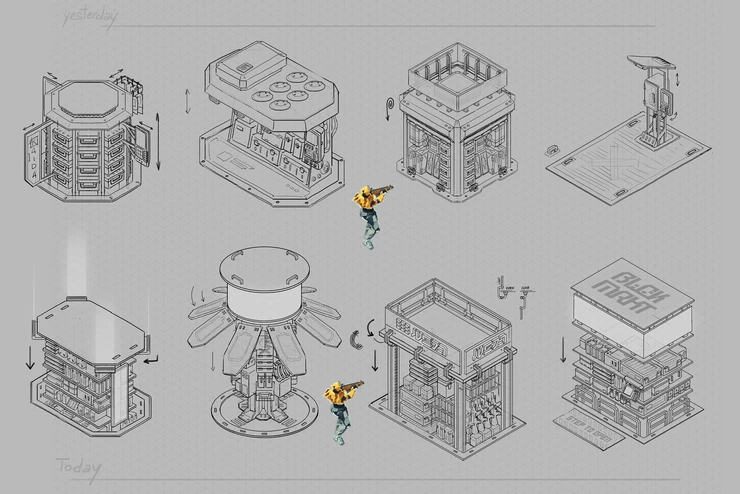Units: All the unique machine designs done for S1 were split amongst the machine factions or adjusted to fit their style, although in many cases minimal changes were needed as they already had a somewhat similar background in mind. Some of them, such as the raider weapons were already spot-on,.